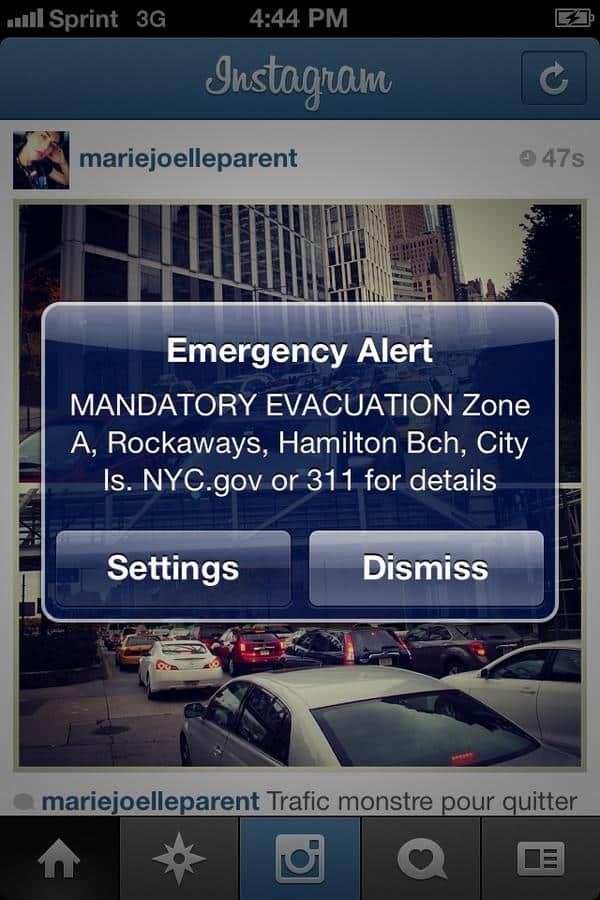 On peut voir l’effet Sandy dans les supermarchés grâce au compte twitter de Stephane Jourdain mais aussi que certaines personnes reçoivent directement sur leur application mobile un avertissement ! Merci à Marie-Joelle Parent pour la photo de l’application.