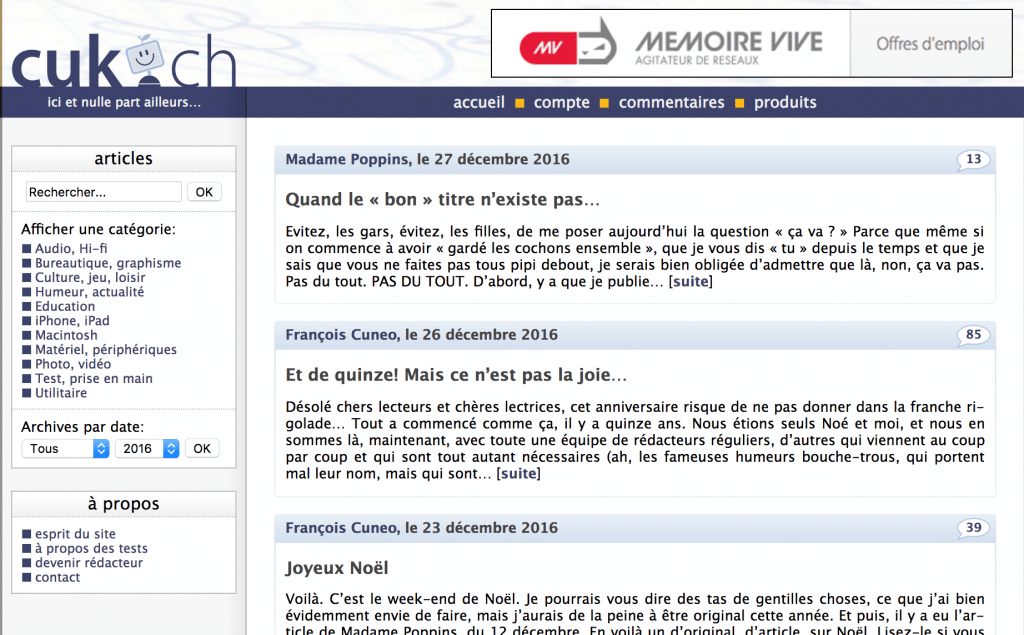 Revenons aux deux sites que j’ai cités au début de ce billet. Il y a d’abord Cuk. Je suis tombé dessus en faisant une recherche sur Google il y a bout de temps. Je cherchais un test de Todoist, mon gestionnaire de tâches actuel. J’ai découvert un test absolument génial mais surtout, complet. J’ai vu rapidement un site très riche mais je n’ai pas été plus loin. J’y suis retourné cette semaine, par hasard, pour découvrir un billet du fondateur du site lassé par les quelques personnes qui veulent toujours amener des ondes négatives partout où ils passent, en laissant des commentaires négatifs, en crachant dans la soupe.