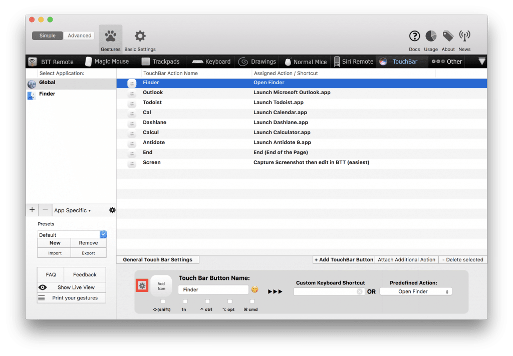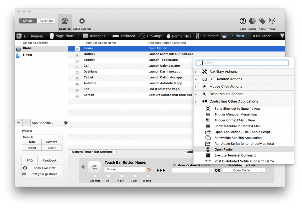 Choisissez d’abord l’action que vous souhaitez réaliser (ouvrir le finder, ouvrir une application, faire un screenshot…) dans la liste à droite « Predefined Action ». Vous pouvez également demander que le bouton action un raccourci clavier, dans la case précédente « Custom Keyboard Shortcut ».